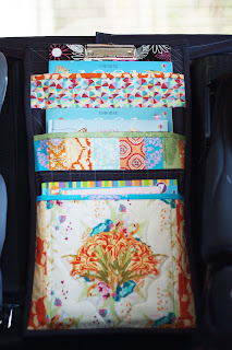 I'm a quilter at heart, so I tackled this project like any good little quilter would...I made mini quilts....4 of them. I measured the space in my backseat and started with one large solid mini quilt as the back piece (that's Kona charcoal as my additional fabric). Then I drew out a little diagram to figure out the size of my three pocket minis [My measurements: total dimensions 12"x22". Mini quilts are 9", 14", and 19" in height x 12" in width.] and dreamed up cutie little designs for each. You only see a couple of inches of the two middle pockets so they are only pieced along the top edge. I made sure to save a nice large hunk of the Lillybelle bouquet for front and center. I added a layer of heavy weight interfacing to the back of each quilt top, then made a sandwich with each of the pieced tops, a layer of batting, and a solid piece of charcoal for the back of each. I quilted each mini and bound the top edge of the three pockets.
